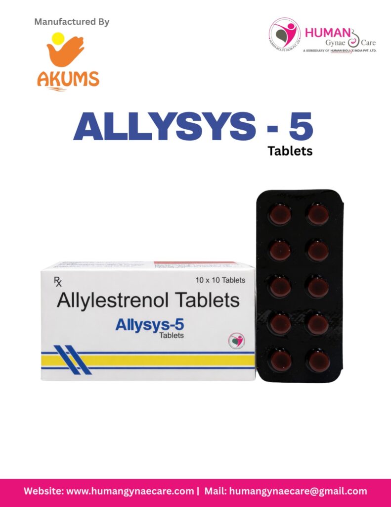 Allysys-5 tablets with powerful formulation of Allylestrenol 5mg are used to support pregnancy in women with progesterone deficiency. They help maintain uterine stability, support fetal development, and reduce the risk of pregnancy complications.