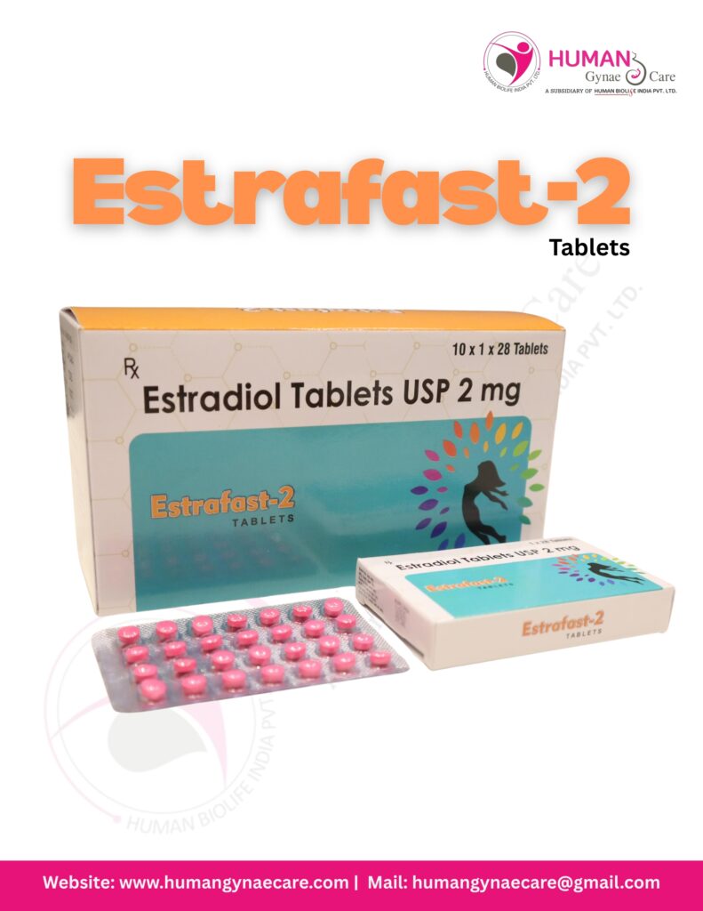Estrafast-2 Tablets with powerful formulation of Estradiol 2mg is a hormone medicine used to replace or supplement estrogen in the body. It is commonly prescribed to treat symptoms of low estrogen levels, regulate menstrual cycles, and support hormone therapy in women.