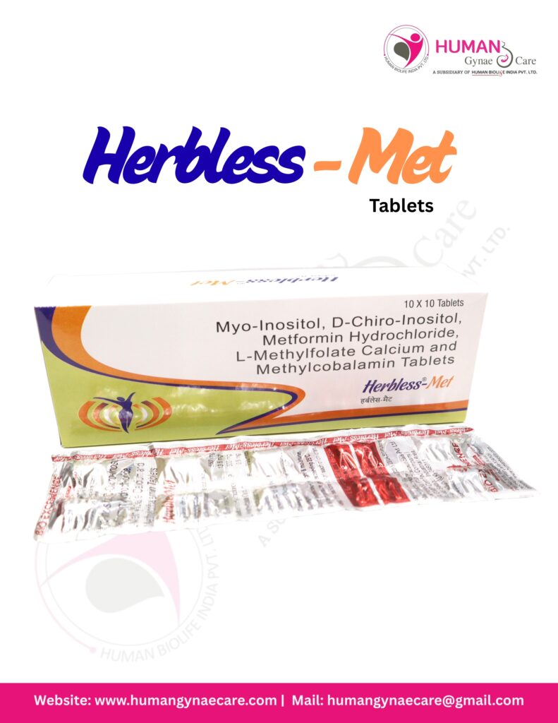 Herbless-Met Tablets with powerful formulation of Myo-inositol IP 550mg+ D-chiro inositol 13.8mg+ mecobalamin IP 750mcg + metformin hydrochloride IP 500mg+ l methylfolate calcium 0.5mg is commonly used in women with polycystic ovary syndrome (PCOS), insulin resistance, and fertility-related hormonal imbalance. It helps regulate menstrual cycles, improve ovulation, enhance insulin sensitivity, and support overall reproductive health while providing essential vitamin support.