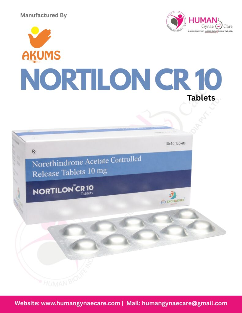 Nortilon CR 10 Tablets with powerful formulation of Norethisterone acetate BP 10 mg, controlled release are used to manage menstrual disorders and hormone-related conditions. They help control abnormal bleeding, regulate cycles, and provide progesterone support in women with hormonal imbalance.