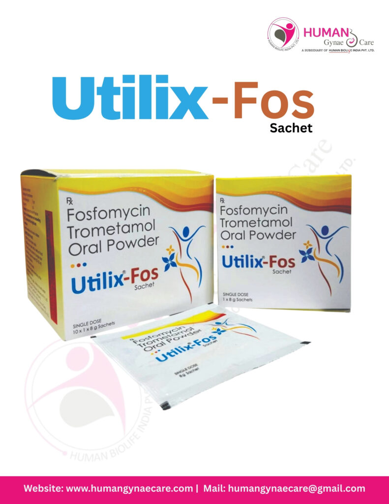Utilix-Fos Sachet with powerful formulation of Fosfomycin Trometamol 3gm is a broad-spectrum antibiotic specially used for urinary tract infections (UTIs). It works by inhibiting bacterial cell wall synthesis, leading to rapid destruction of infection-causing bacteria in the urinary tract. Due to its high urinary concentration and convenient single-dose therapy, it is widely preferred for uncomplicated UTIs, especially in women.
